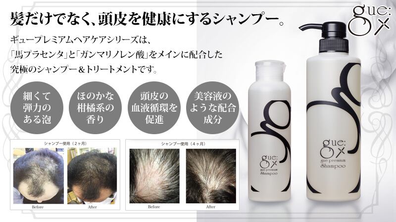 ギュープレミアムヘアケアシリーズは、 「馬プラセンタ」と「ガンマリノレン酸」をメインに配合した究極のシャンプー&トリートメント。